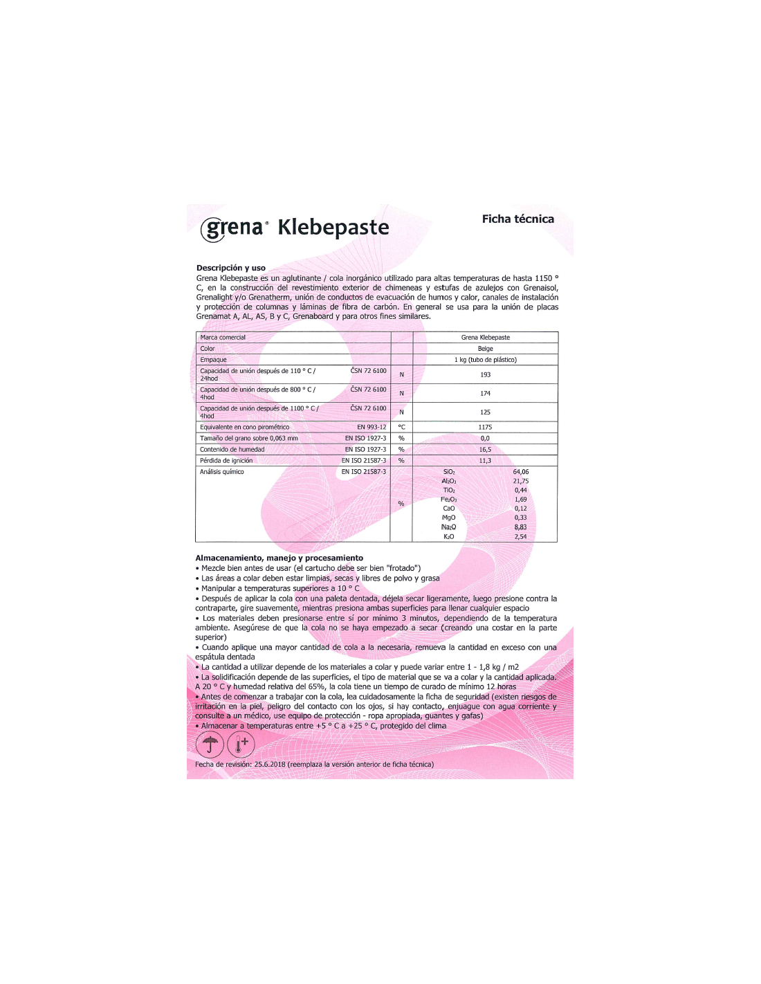 Características Detalle de unión con adhesivo GRENA KLEBEPASTE es un adhesivo inorgánico que inclusive expuesto a altas temperaturas no emite gases ni materiales inflamables.
